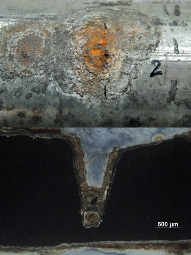 Oft ist nur ein kleiner weißer Fleck auf der Oberfläche zu erkennen, doch bei genauerem Hinschauen sieht man, dass die Titanzinkeindeckung ein Loch aufweist. Eine Öffnung des Dachmetalls ergibt dann meist die ernüchternde Wahrheit – großflächige Zerstörung der Unterseite des Titanzinks durch Unterseitenkorrosion; auch Weißrost genannt.
