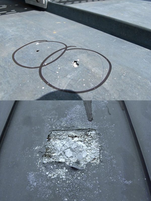 Oft ist nur ein kleiner weißer Fleck auf der Oberfläche zu erkennen, doch bei genauerem Hinschauen sieht man, dass die Titanzinkeindeckung ein Loch aufweist. Eine Öffnung des Dachmetalls ergibt dann meist die ernüchternde Wahrheit – großflächige Zerstörung der Unterseite des Titanzinks durch Unterseitenkorrosion; auch Weißrost genannt.